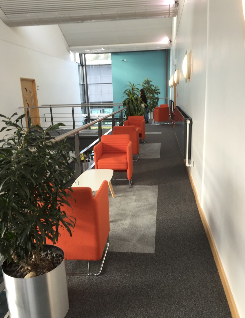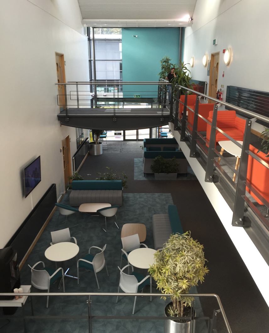 Overview/ After successfully bidding to supply all the new furniture for the common areas in the new Phase 5 building Engage Workplace were asked to refurbish and furnish the common areas in Phase 2. This entailed a full redecoration, new carpet throughout, refurbished wooden stairwells and strip out and refurbish tenants showers on all floors. Working in conjunction with the Science Park Estates department the furniture layout and specification was agreed.